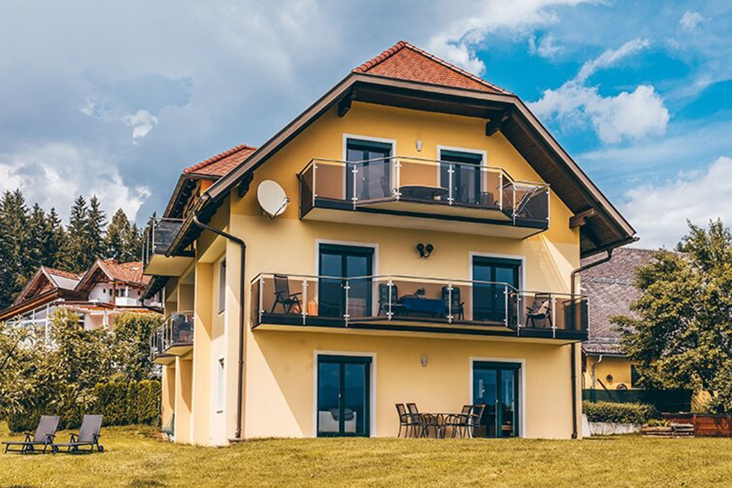 Die beiden Ferienwohnungen, mit jeweils etwa 67m² sind ganzjährig verfügbar. Mit Wohnküche inkl. Geschirrspüler, Bad und WC (getrennt) und einem Schlafzimmer sowie Balkon mit atemberaubendem Blick auf den See, den Pyramidenkogel und die Kirche von Maria Wörth bieten sie Platz für bis zu fünf Personen.